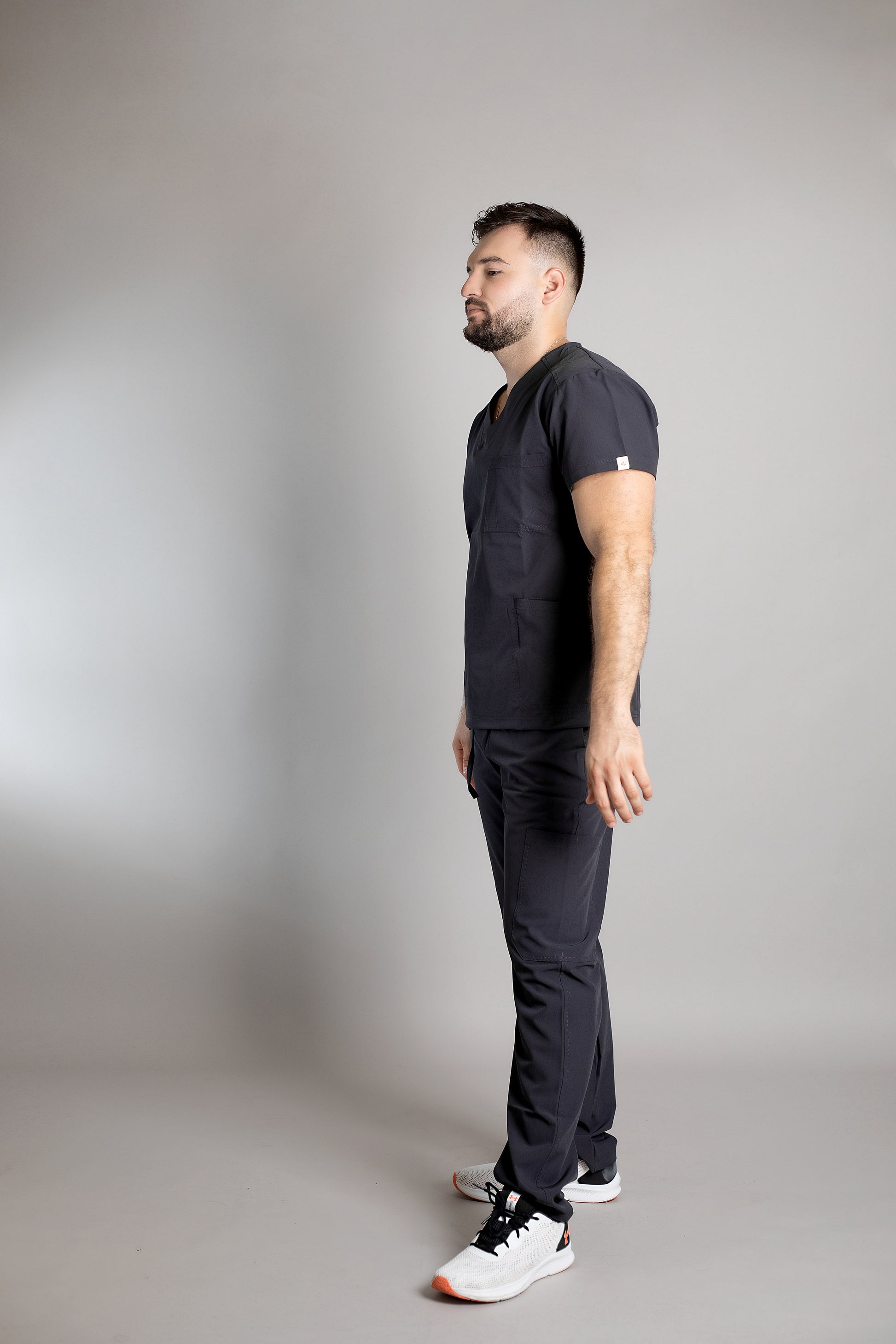 Modelo para caballero. Diseño exclusivo con pantalón en corte entubado.Tela antifluidos, anticloro con un grado impermeable. Protección UV. Se lava en casa, de secado rápido. Hecho por manos mexicanas.Composición: Spandex con Poliéster. En pedidos mayores a 25 sets de scrubs, considerar de 30 a 45 días para entrega.